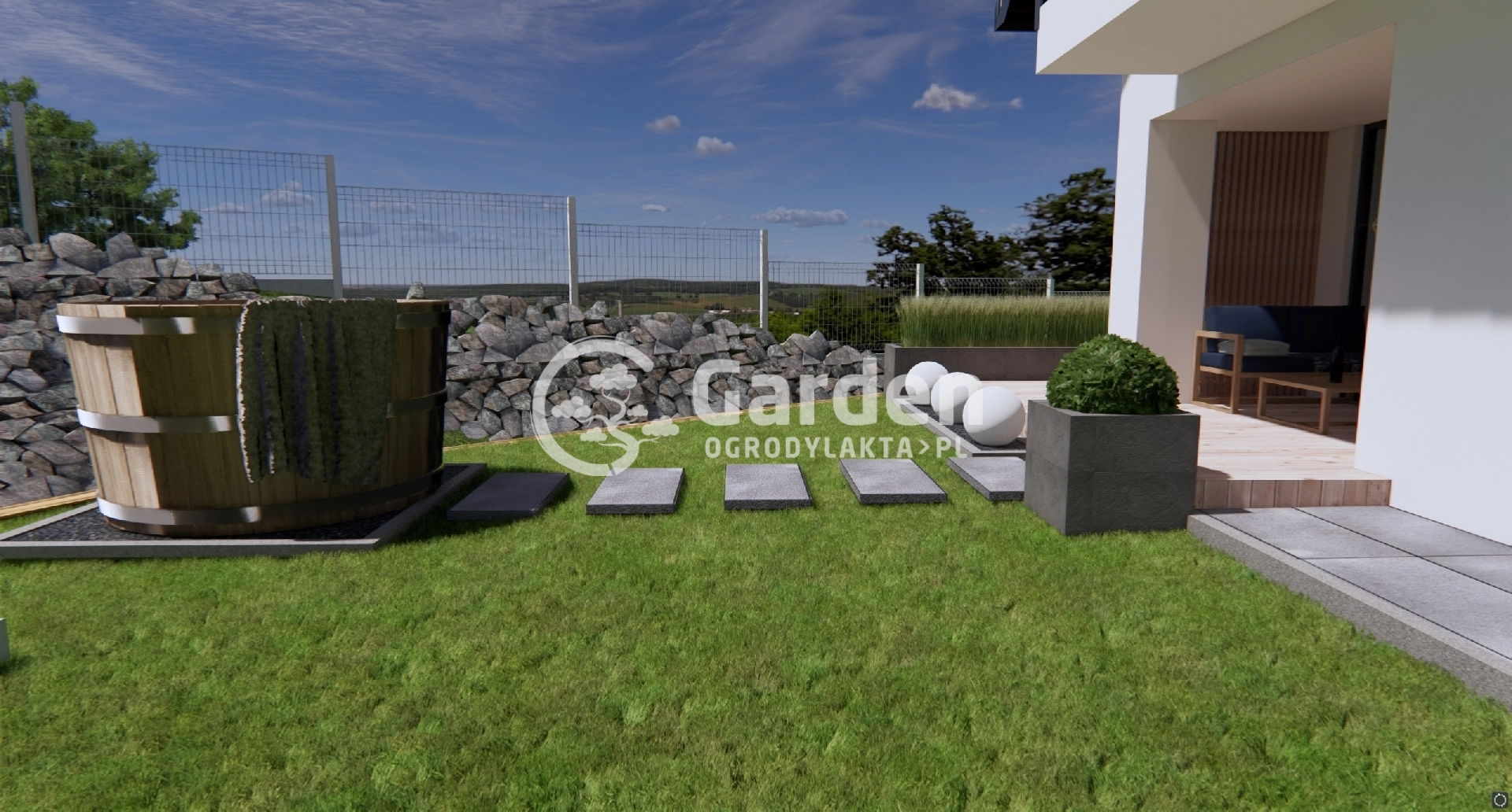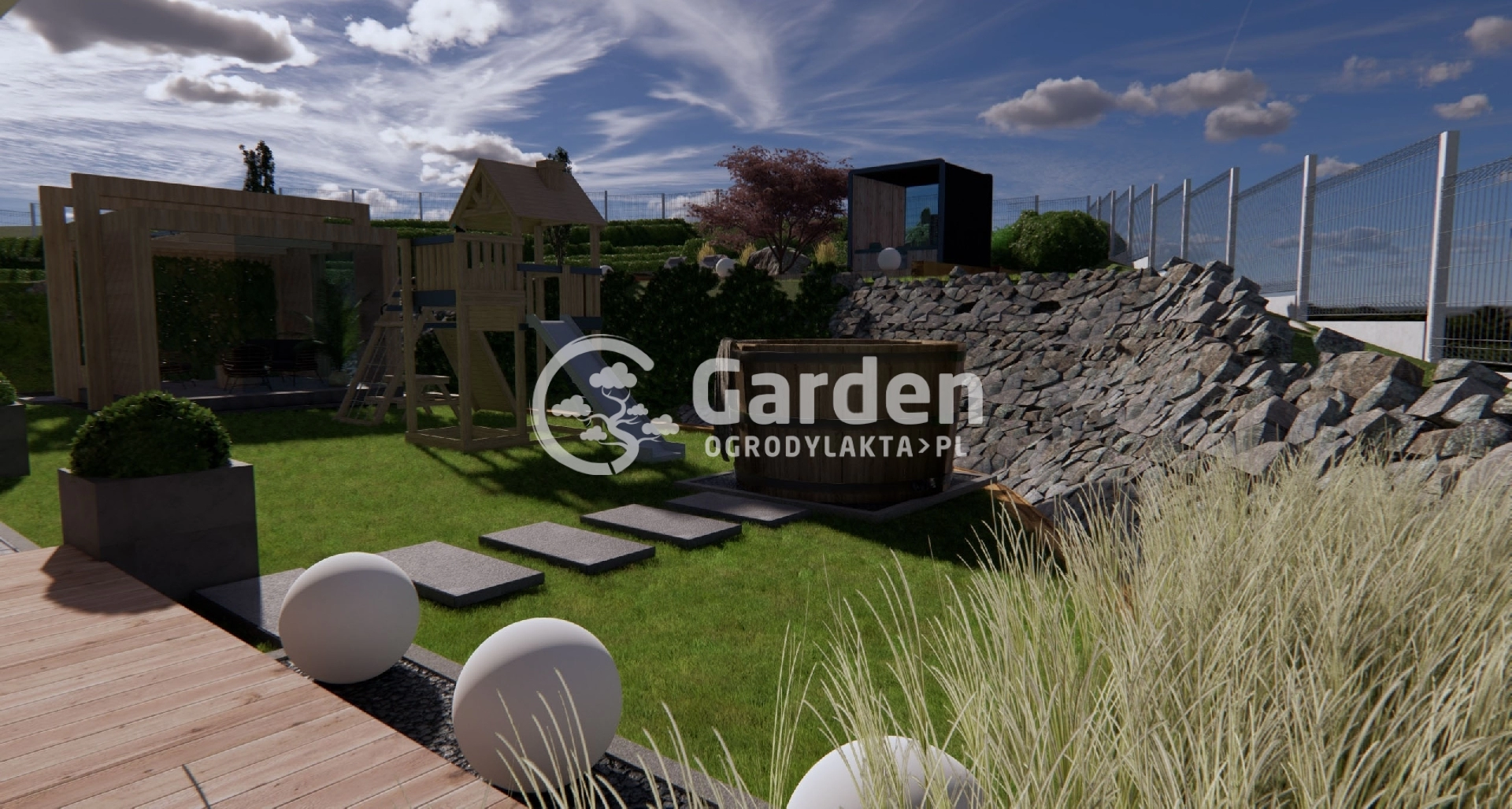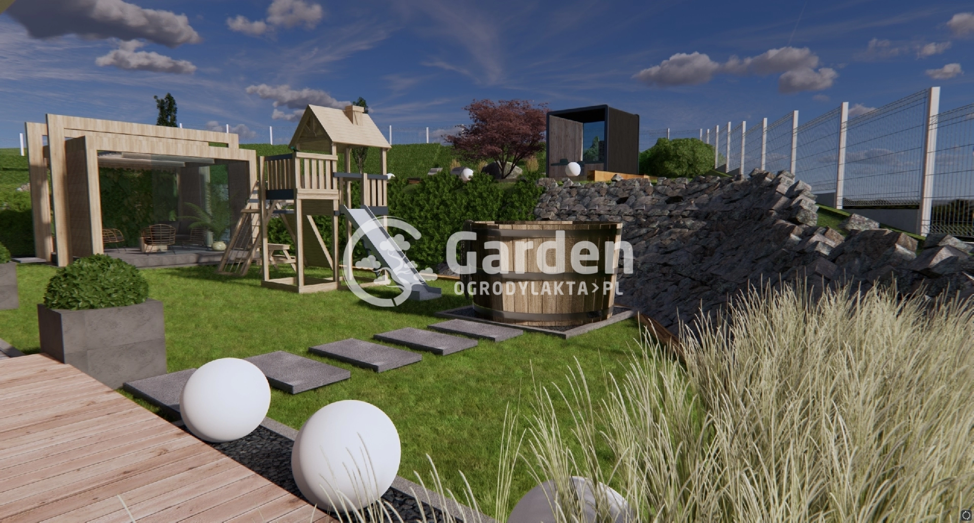 W ogrodzie oprócz sauny zaprojektowaliśmy również jacuzzi. Można do niego dojść bezpośrednio z przydomowego tarasu po dużych kamieniach ułożonych w ścieżkę. Obok jacuzzi znajduje się plac zabaw z myślą o młodszych domownikach.