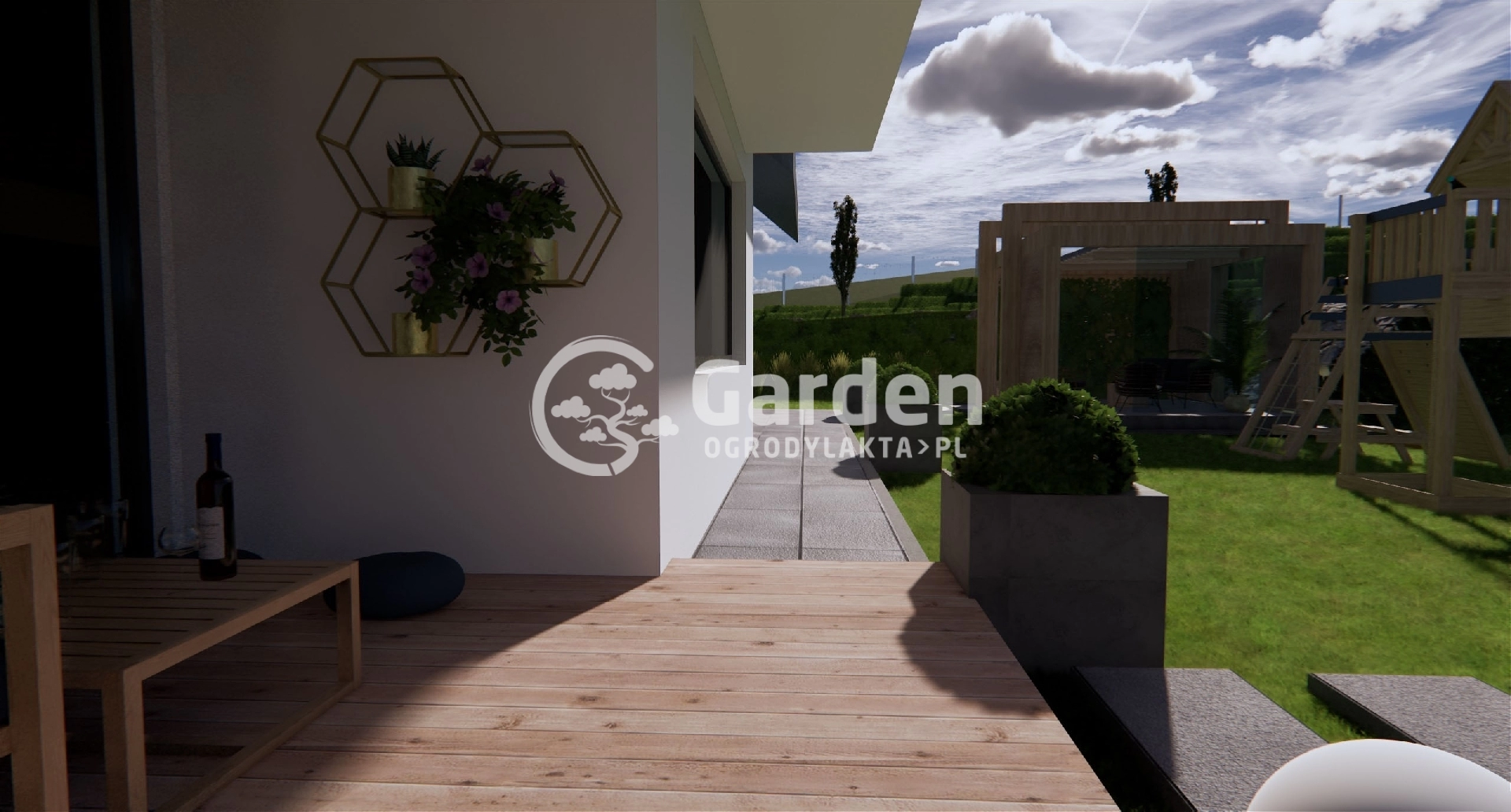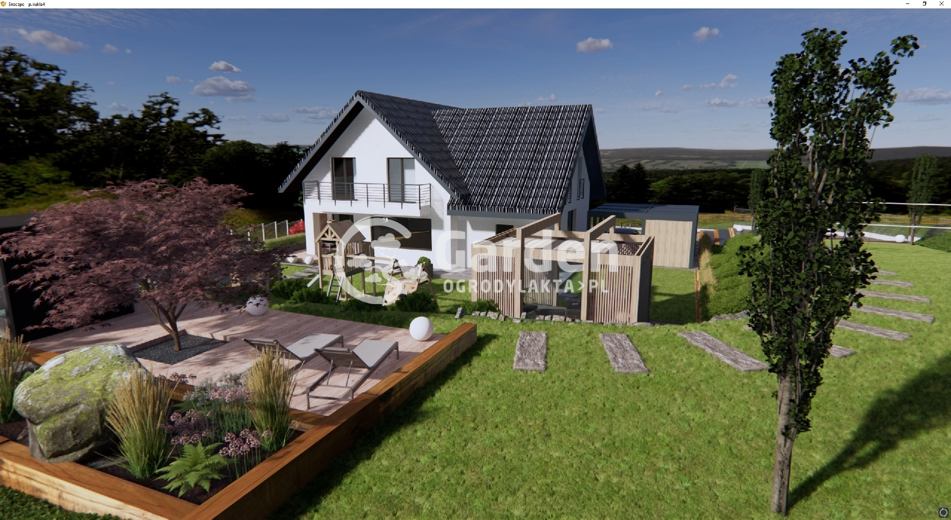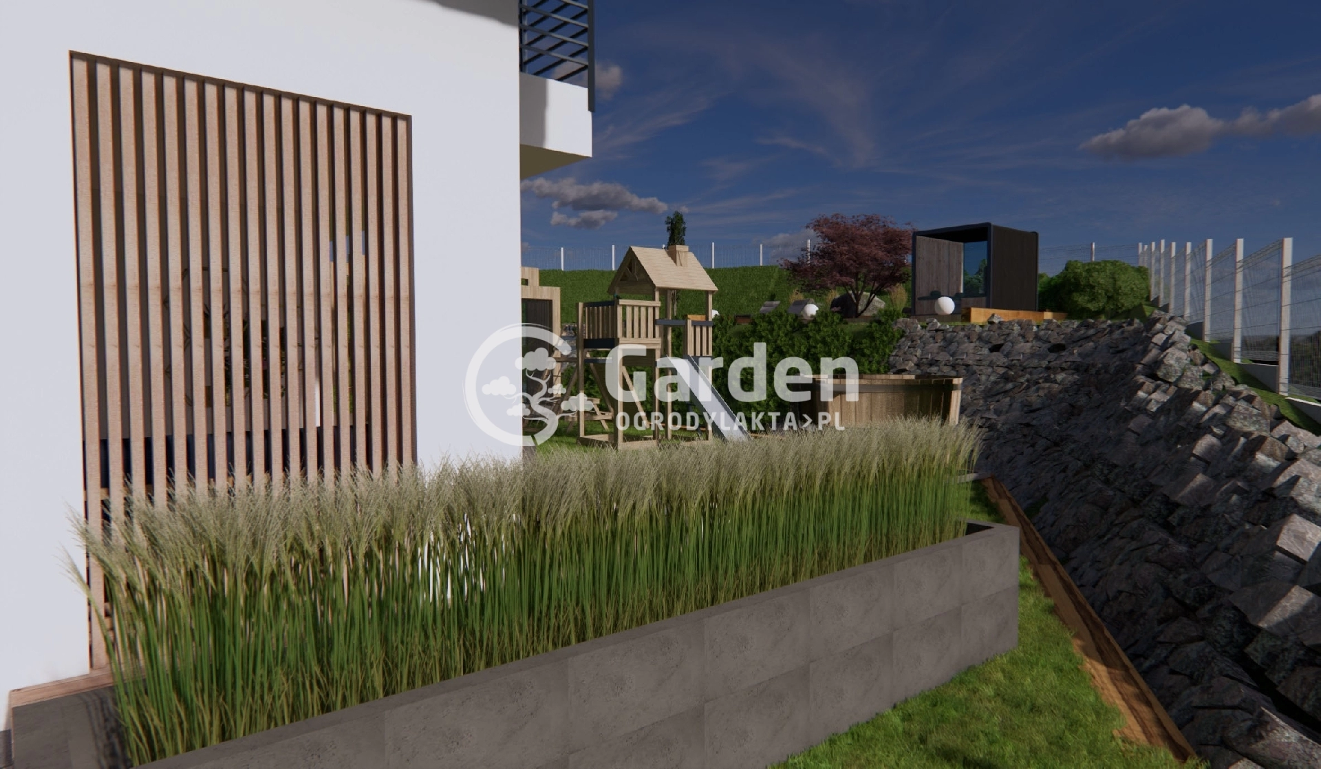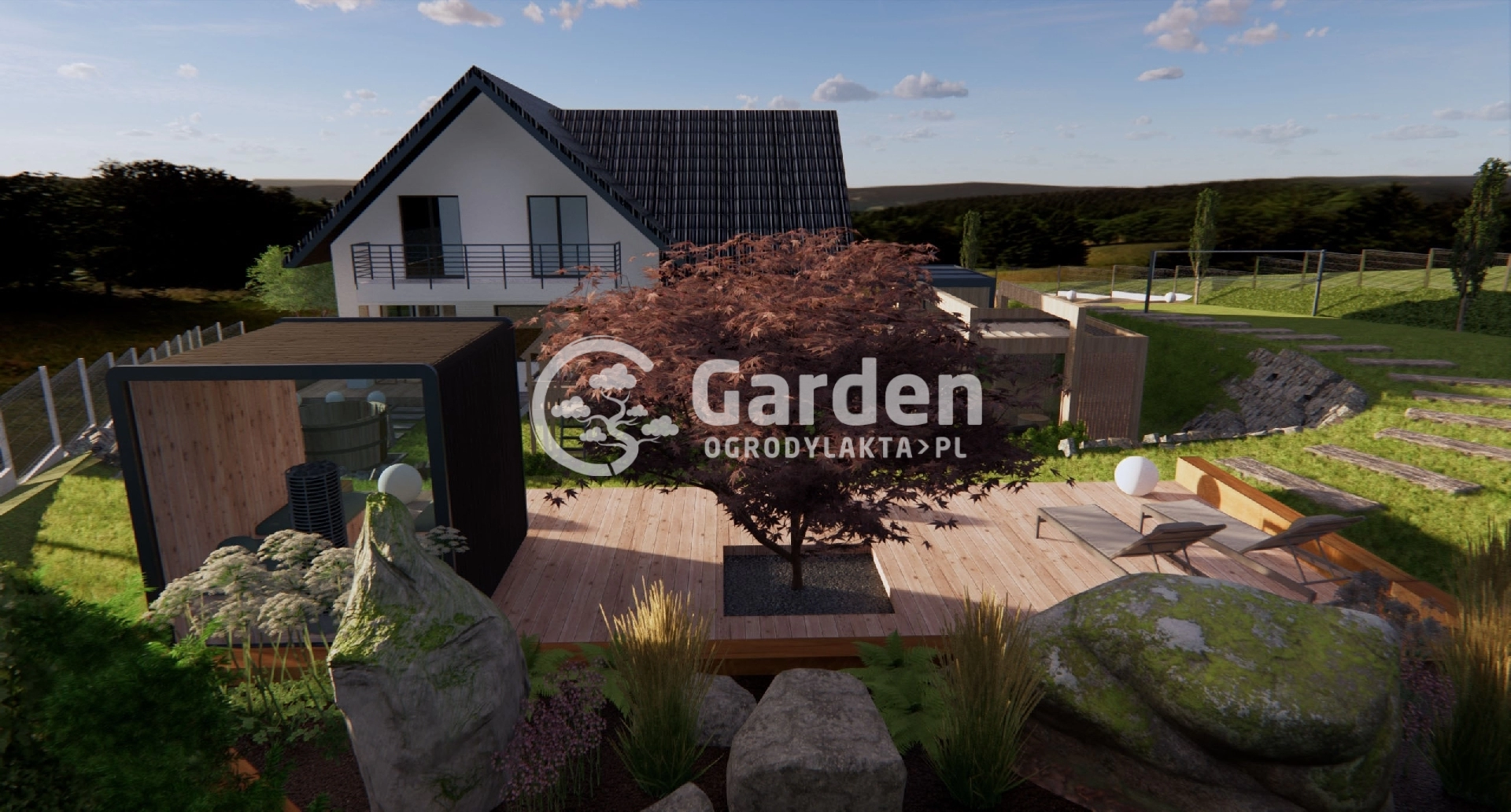 W ogrodzie oprócz sauny zaprojektowaliśmy również jacuzzi. Można do niego dojść bezpośrednio z przydomowego tarasu po dużych kamieniach ułożonych w ścieżkę. Obok jacuzzi znajduje się plac zabaw z myślą o młodszych domownikach.