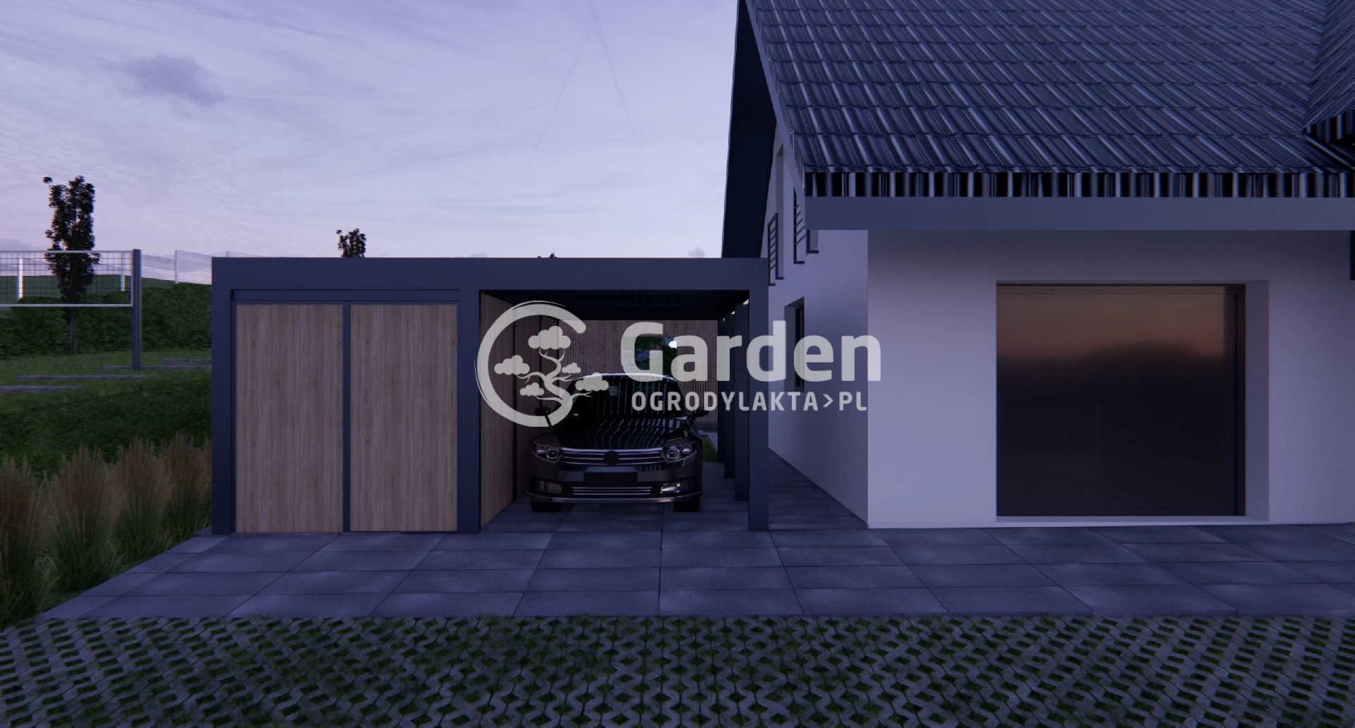 W naszych projektach ogrodu zawsze uwzględniamy istniejącą zabudowę oraz otaczający krajobraz, żeby nowe elementy dobrze wpasowały się do tych już obecnych. Garaż, który zaprojektowaliśmy to bryła o prostych kształtach, która świetnie komponuje się ze stylem, w jakim został wybudowany dom inwestora z Łąkty. Rama garażu doskonale pasuje kolorystycznie do dachu domu czy kostki, a drewno stanowi naturalny dodatek nawiązujący do elementów znajdujących się w dalszej części ogrodu.