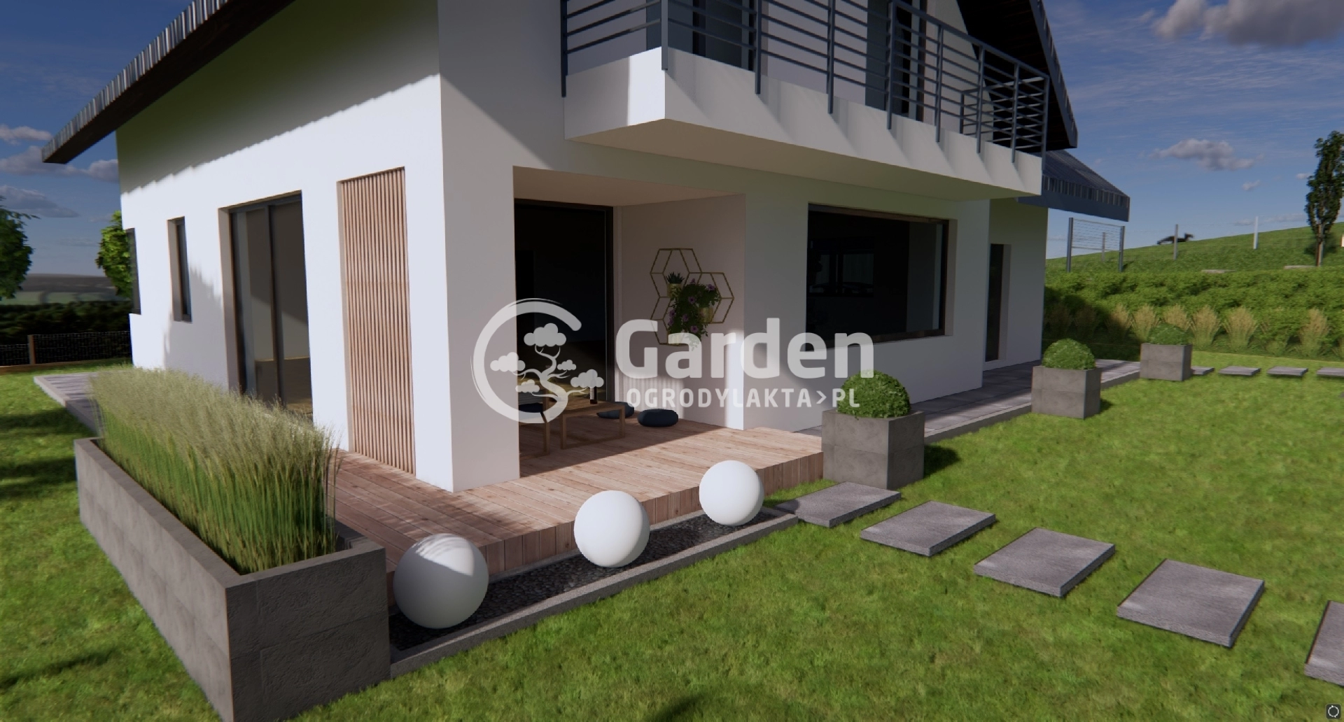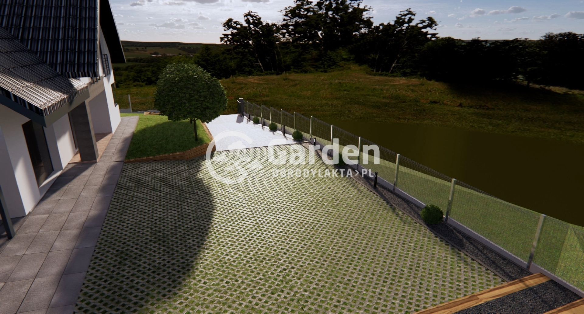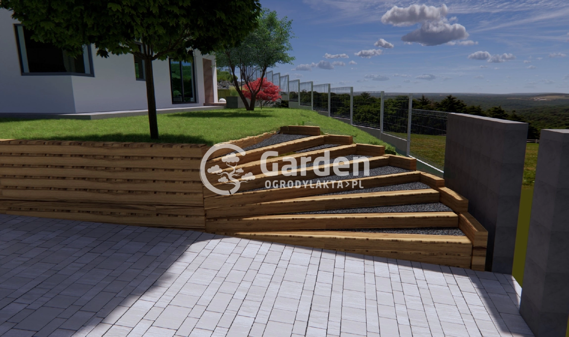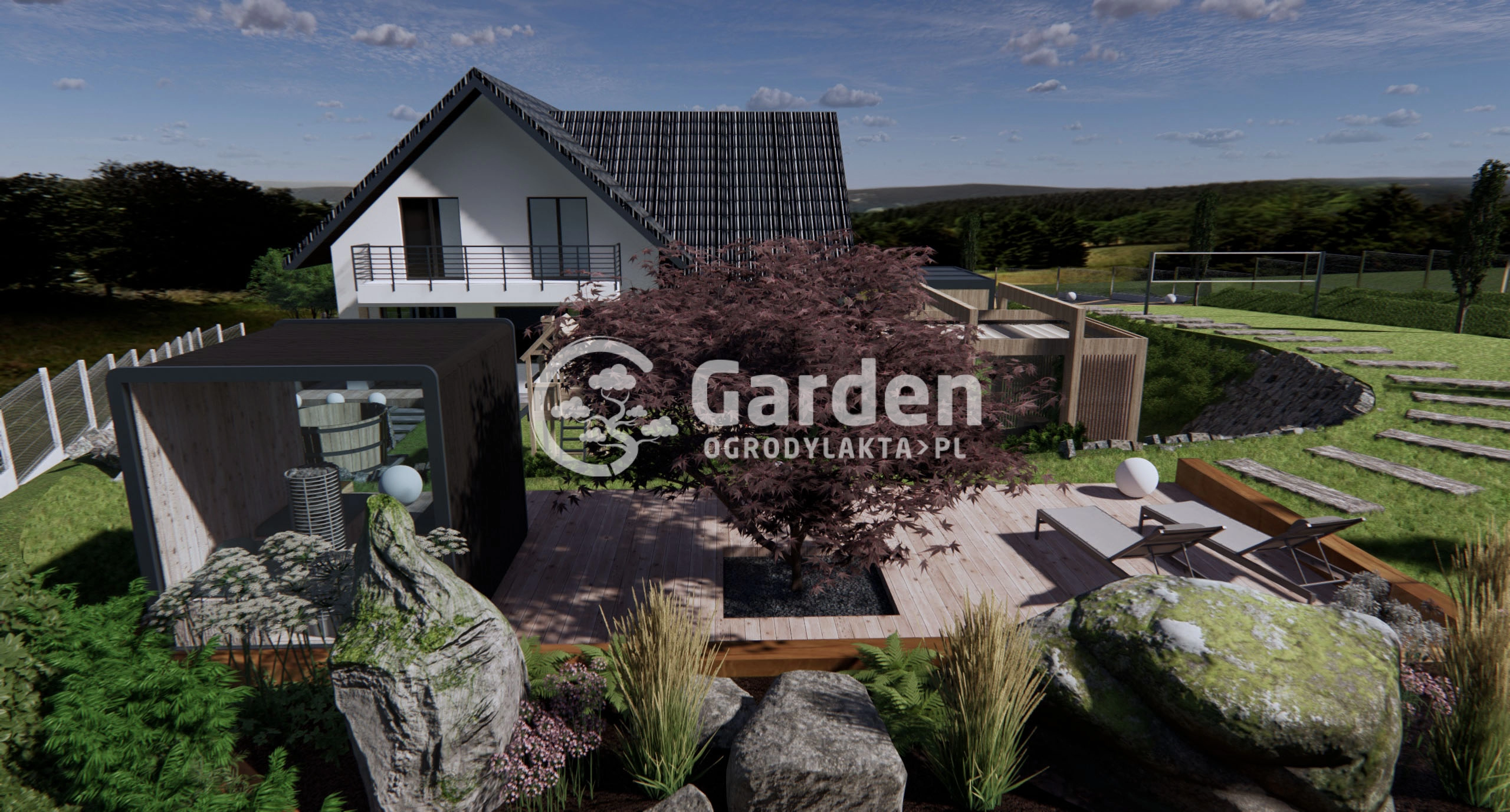 Ogród to dobre miejsce nie tylko do relaksu, ale również do uprawiania sportu. Dlatego w projekcie ogrodu w Łąkcie wyznaczyliśmy przestrzeń, która będzie stanowić boisko do gry w siatkówkę. Ta część ogrodu została połączona z podjazdem za pomocą eleganckich, drewnianych schodów.