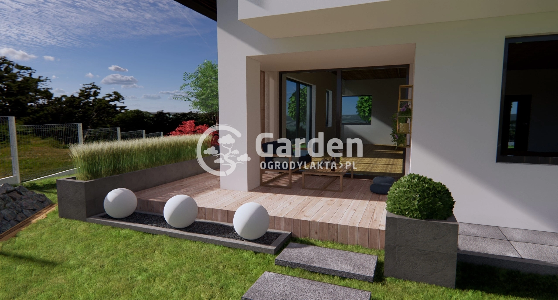 W ogrodzie zaprojektowaliśmy dwa tarasy wykonane z drewna. Jeden znajduje się przed domem, a drugi w dalszej części ogrodu. Uwzględniliśmy miejsce na wygodne fotele, gdzie można się zrelaksować i odpocząć. Taras ogrodowy posiada również wycięcie, w którym posadzone zostanie drzewo, a obok niego znajdować będzie się sauna. Jest ona przeszklona, a więc będzie można podziwiać ogród i pobliski krajobraz z jej wnętrza.